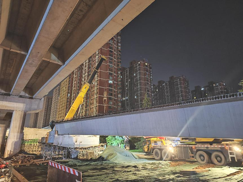 | 槐安路高架西延?xùn)|側(cè)匝道首片預(yù)制箱梁順利架設(shè) |